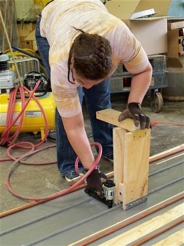 Gary Reysa design, for squeezing the fins onto the risers. In the next photo Sherri demonstrates how one person can squeeze a fin and staple at the same time.