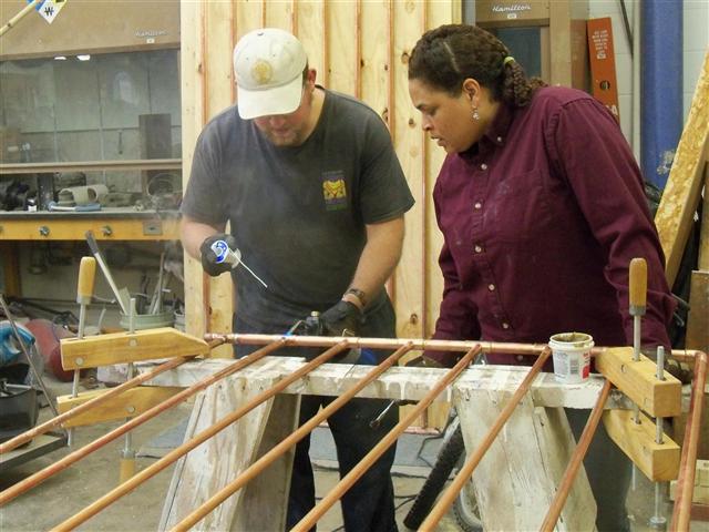 My six collector arrays are made of 1/2" copper pipe soldered to 3/4" manifolds top and bottom. Each array was sized to fit on a 4x8 plywood sheet. I used reducing tees to connect the risers to the manifolds (which I managed to find for just about $1 each at pexsupply.com). Below, Sherry Bolden (my student intern) instructs another student (Charles Machia) who wanted to join in the fun.