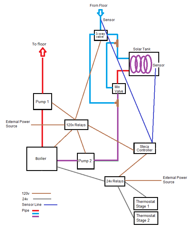 - When Stage 2 calls for heat, it causes another relay to close, which cuts off power to the Steca controller, which closes the 3-way valve. This means that all circulating water will now skip the solar loop. The boiler also gets a heat signal at this point (in a closed loop with itself, thanks to the relay), and it then powers the pumps (the same pumps that are used when in solar mode), and fires as needed to generate heat.