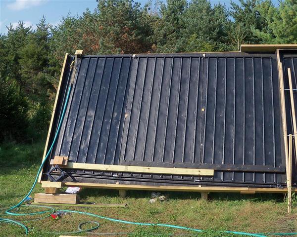 Later Note: "Best practices" for building arrays like these continue to evolve, as can be seen on builditsolar.com. I might consider dispensing with the plywood panels to which the copper arrays were attached. The copper arrays could be sandwiched with aluminum, held tightly together by small screws, and each array set into the frame right on top of the insulation, or perhaps with a thinner piece of plywood set in between. I would also consider making the overall array frame larger so that I could use full size 4x8 twinwall panels, with no cutting involved. The frame is easy to build, of course, using 4x8 plywood sheets, but it could be made a bit larger than the 6 plywood sheets easily enough. The key is in sizing eveything, and placing the 2x4 verticals, so that the twinwall panels will line up where they need to be, given the batten system being used.